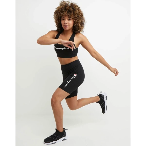 - Screenprint Champion script logo on left leg. Iconic C patch logo at center back waist.