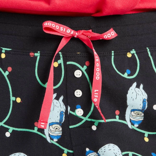 - Elastic encased rib waistband. Twill drawcord with Life Is Good print.