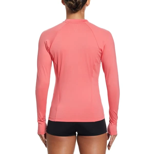 Featuring UPF 40+ sun protection, this Nike women’s hydroguard will help you stay safe as you enjoy a swim under clear blue skies. The long sleeve water shirt is crafted from soft jersey knit fabric for all-day comfort, and it has Dri-FIT technology to help manage moisture when you’re back on dry land. A full-zip closure makes the rash guard easy to pull on and off as the weather changes and lets you adjust how much of your swimsuit is exposed. A screenprinted Swoosh on the chest adds an eye-catching accent to the design.