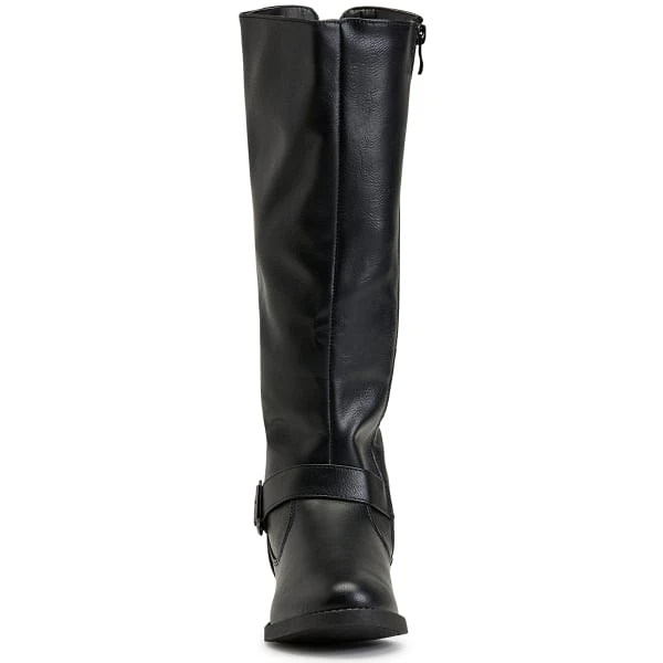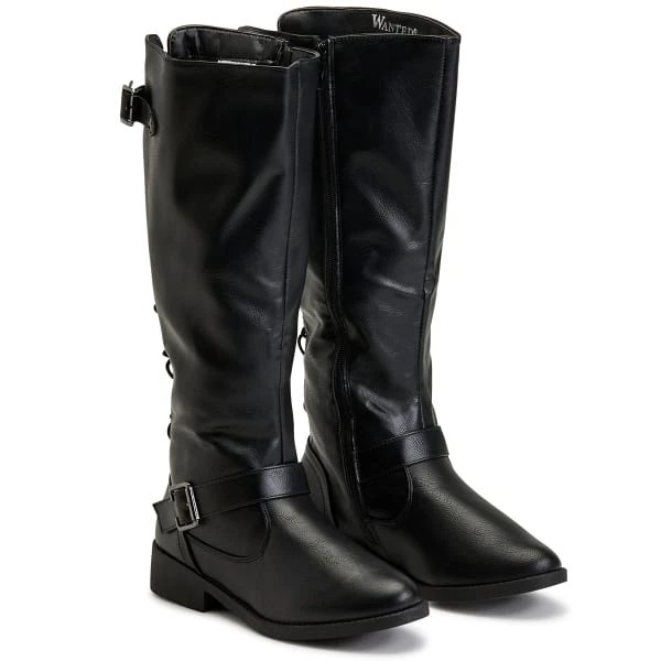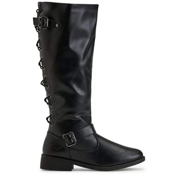 The Lady Luck knee high riding boot features a faux leather upper and decorative lace-up back. Pair with jeans for a sharp look on any occassion.